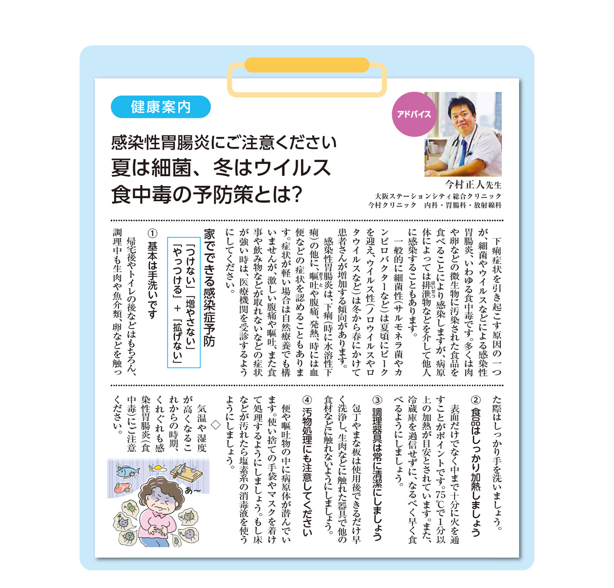 読売ライフ掲載のお知らせ(令和7年8月号) 投稿日:2025.08.22 03:05 今村クリニック 今村 正人 先生が読売ライフの「健康案内」に掲載されました。 掲載月:令和7年8月号 テーマ:感染性胃腸炎にご注意ください 夏は細菌、冬はウイルス食中毒の予防策とは? 掲載記事はこちら 過去の記事はこちら