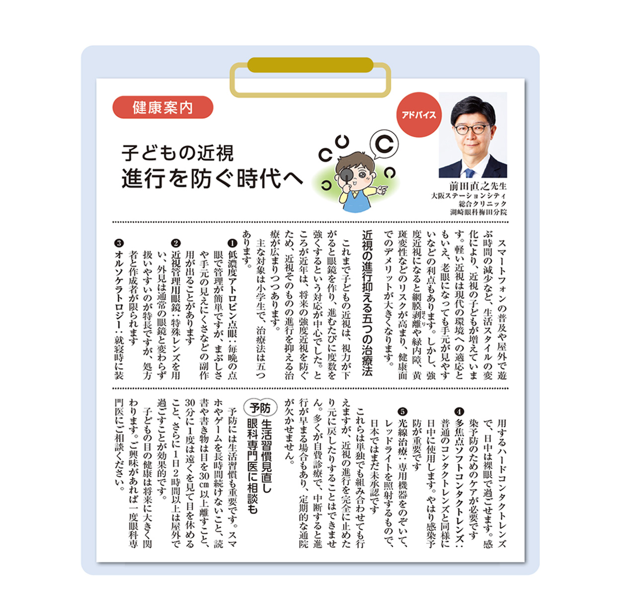 読売ライフ掲載のお知らせ(令和8年2月号) 投稿日:2026.02.20 05:52 湖崎眼科 前田 直之 先生が読売ライフの「健康案内」に掲載されました。 掲載月:令和8年2月号 テーマ:子どもの近視 進行を防ぐ時代へ 掲載記事はこちら 過去の記事はこちら