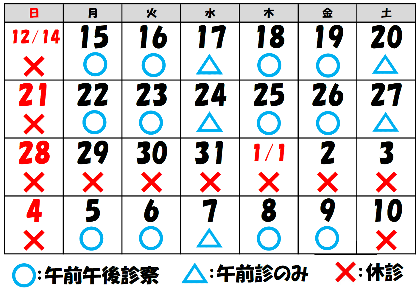 年末年始は12月28日(日)から1月4日(日)まで休診いたします。
